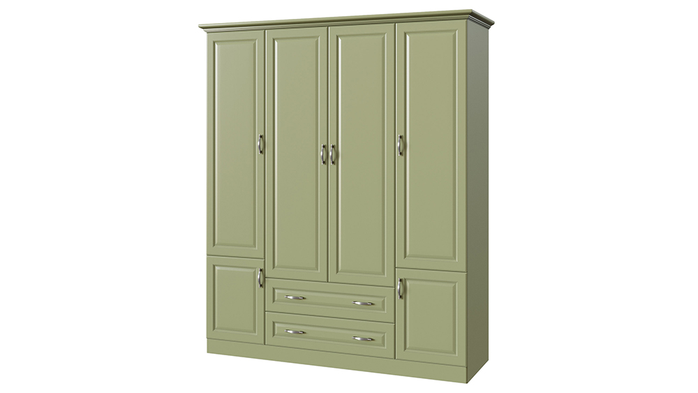 Классический шкаф, созданный в едином стиле с коллекцией Эдем — изделие без которого не возможно себе представить спальню. Корпус шкафа может быть изготовлен как из массива бука и ясеня, так и из массива мягколиственных пород, что делает его стоимость еще более демократичной. Четырех створчатый шкаф имеет 3 базовые комплектации: c антресольной секцией в верхней (4-3) или нижней части (4-1) шкафа или двумя выкатными ящиками (4-2) в нижней части шкафа. В стандартном оснащении двух створчатая секция шкафа располагается по центру шкафа и имеет два выкатных ящика. Фасады шкафа могут иметь встроенные зеркала, как на лицевой части фасада — по размеру филенчатой части, так и на внутренней стороне фасада. Распашные дверцы шкафа оснащены петлями с системой до-закрытия в базовой комплектации. В широкой центральной секции шкафа предусмотрена штанга для плечиков, а в малых секциях предусмотрены полки для хранения вещей. По желанию шкаф может быть оснащен любым количеством полок.