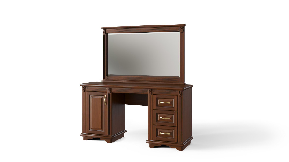 Стол для косметических принадлежностей, украшений, аксессуаров и различных приятных мелочей — Палермо ЭЛИТ, функциональное пространство для личных целей. Единое дизайнерское решение элементов декора, четко выверенные пропорции и безупречнеая функциональность! Все это создают: полноразмерное зеркало с вариантами крепления к стене или к столешнице туалетного стола, 3- выкатных ящика, 1 ниша с распашной дверцей и 1 потайной ящик под столешницей. Высококачественная ручная отделка столика Палермо, как и всей остальной мебели серии Палермо, в полной мере передает любовь и теплоту с которой мастера DreamLine создают мебель. Сборка не требуется.